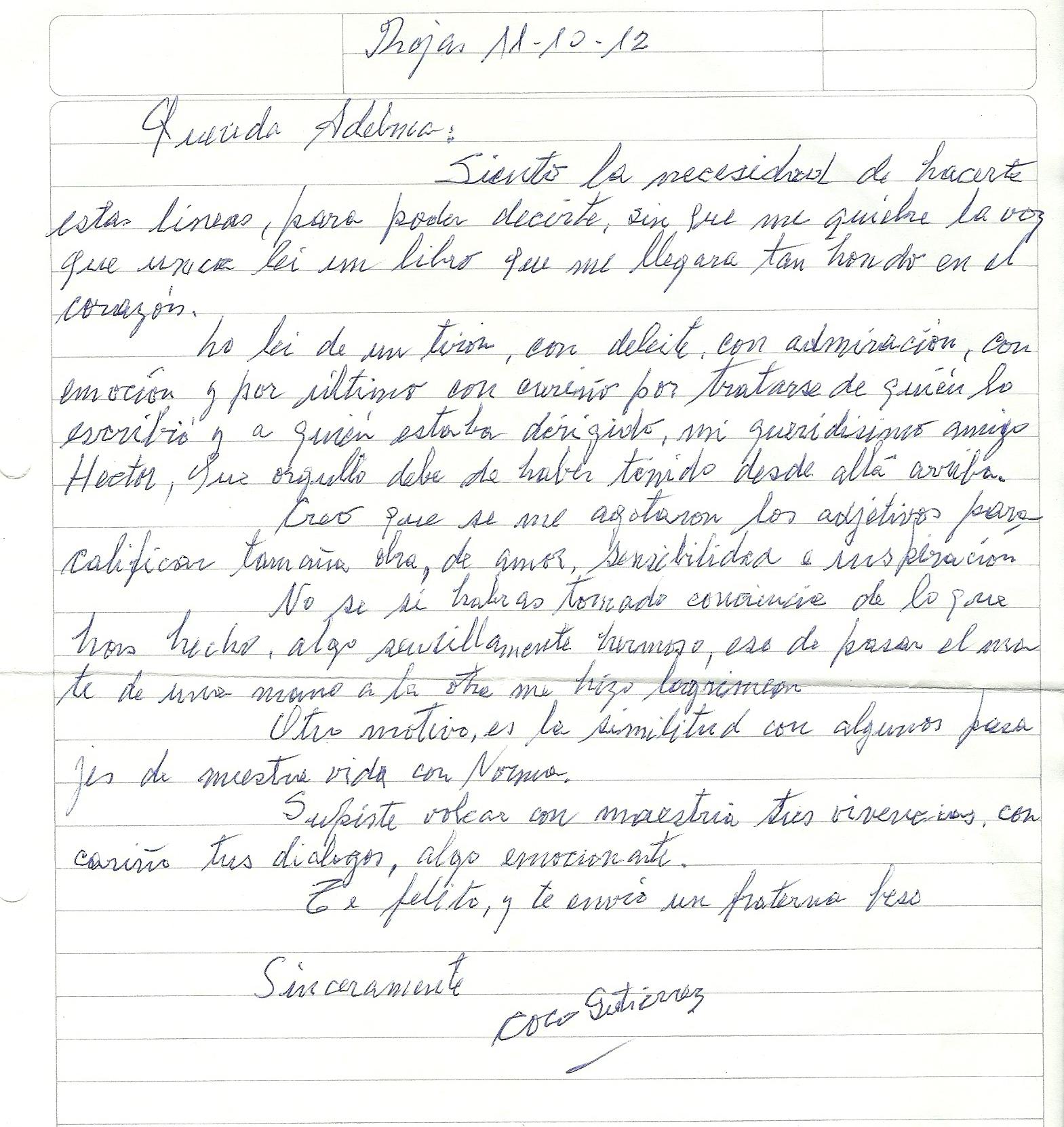 Queridísima amiga mía: acabo de terminar la lectura de tu libro. Y en el último tramo, en los últimos capítulos, con un nudazo en la garganta que sólo devino en llanto cuando leí tu poesía. No por conocerla de antemano me emocionó menos, y puedo decirte que el libro adquiere todo su sentido a la luz del amor que trasunta, ese amor que Héctor y vos se prodigaron,y que es el verdadero protagonista en tu obra. Gracias por permitirme adentrarme en algunos intersticios de esa historia que protagonizaron,y por los buenos y gratísimos momentos de amiga que me brindás (cuando me encontrás, claro,¡ja,ja,ja!!!!) y ojalá todos los lectores de este libro sientan tanta emoción como yo.Un enorme abrazo. Te quiero mucho.